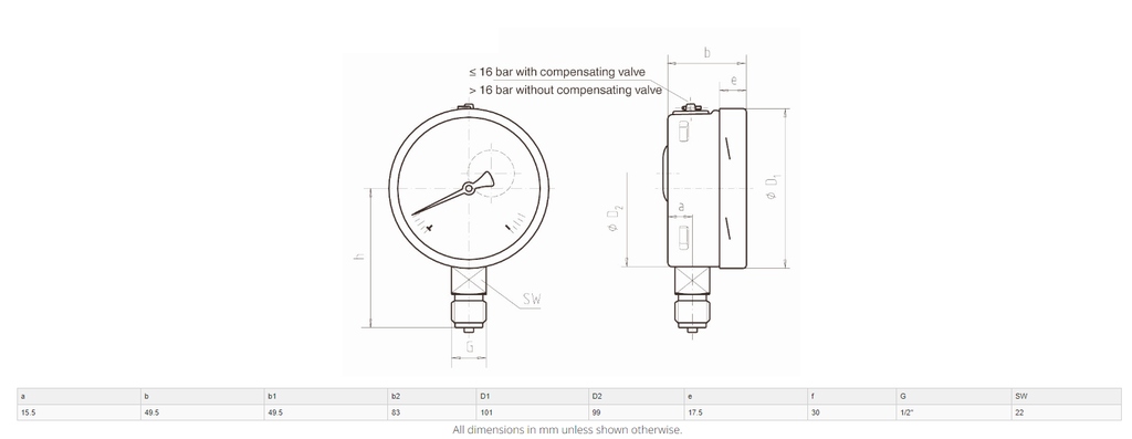 2Stainless Steel 100mm glycerine-filled pressure gauge with brass internals and connection. Crimped ring housing with polycarbonate window. Dual scale kpa/psi. Accuracy +-1.0% of full scale. Operating temp of -20°C to 60°C. For use on compatible gases and liquids.