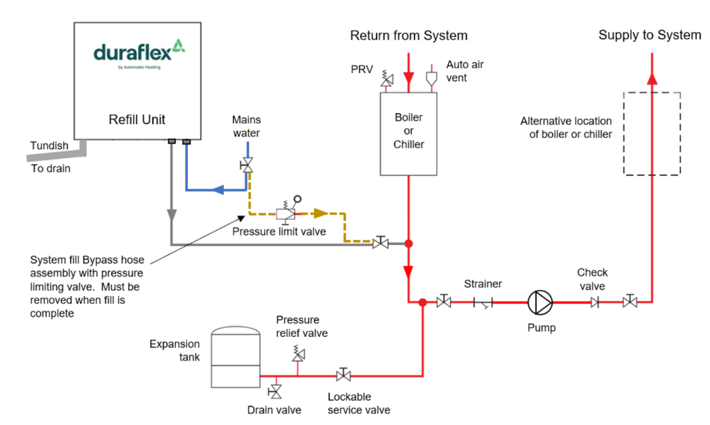 2Duraflex Smart Refill Unit, looks after topup of commercial heating and chilled water systems. monitor system water usage and pressure, warns and protects against detected system leaks, Integrated backflow protection and topup pressure control.